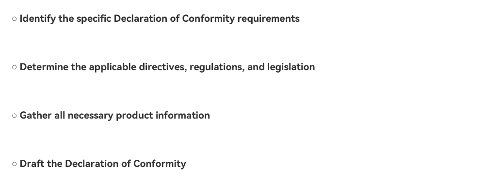 Drafting a DoC can be difficult if you don't know what to include and what to leave out. Declaration of Conformity requirements dictate that all relevant product information must be listed in the document, such as: